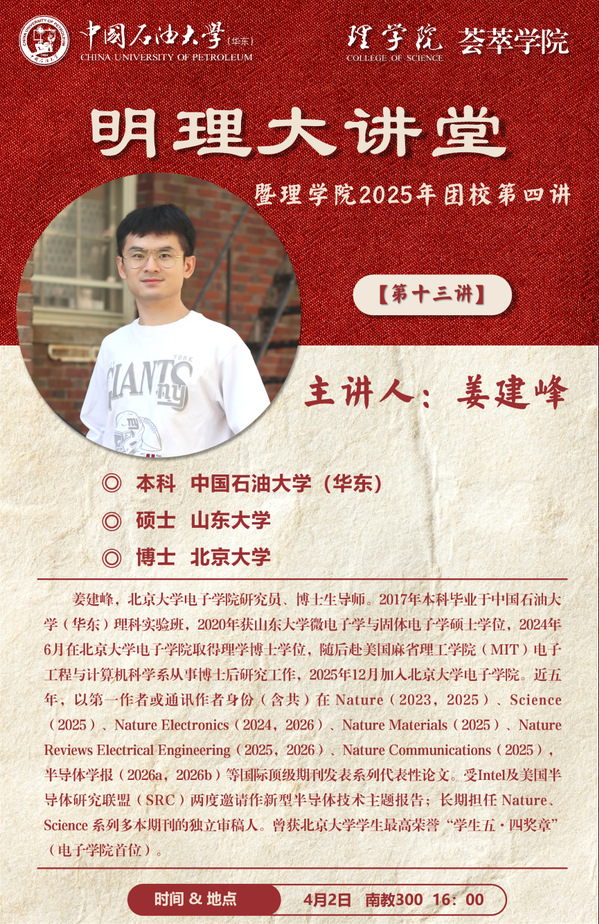 4月2日,理学院在南教300教室举办“明理大讲堂”第十三讲暨理学院2025年团校第四讲。本次活动邀请了北京大学电子学院研究员、博士生导师姜建峰分享,理学院党委副书记朱景顺主持,辅导员刘威、卢萌、邓帅豪及2025级全体本科生参加。