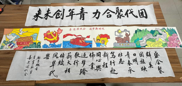 大家还在纯白T恤上尽情挥洒创意,把共青团标识、团代会主题等元素巧妙融入设计,亲手打造专属团代会纪念衫,让青春风采在斑斓色彩中尽情绽放。书法爱好者们更是挥毫泼墨,写下“团代聚合力,青年创未来”等饱含深情的作品,以笔墨传情、以文字言志,用苍劲有力的笔触传递理院学子的青春担当。