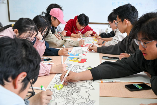 活动现场暖意融融、创意飞扬。同学们围坐长桌,以画笔为心声,在主题长卷上精心勾勒团旗团徽、校史建筑等标志性元素,用斑斓色彩晕染青春信仰,将对共青团的赤诚热爱、对学校发展的美好期许,一笔一画融入创作之中。